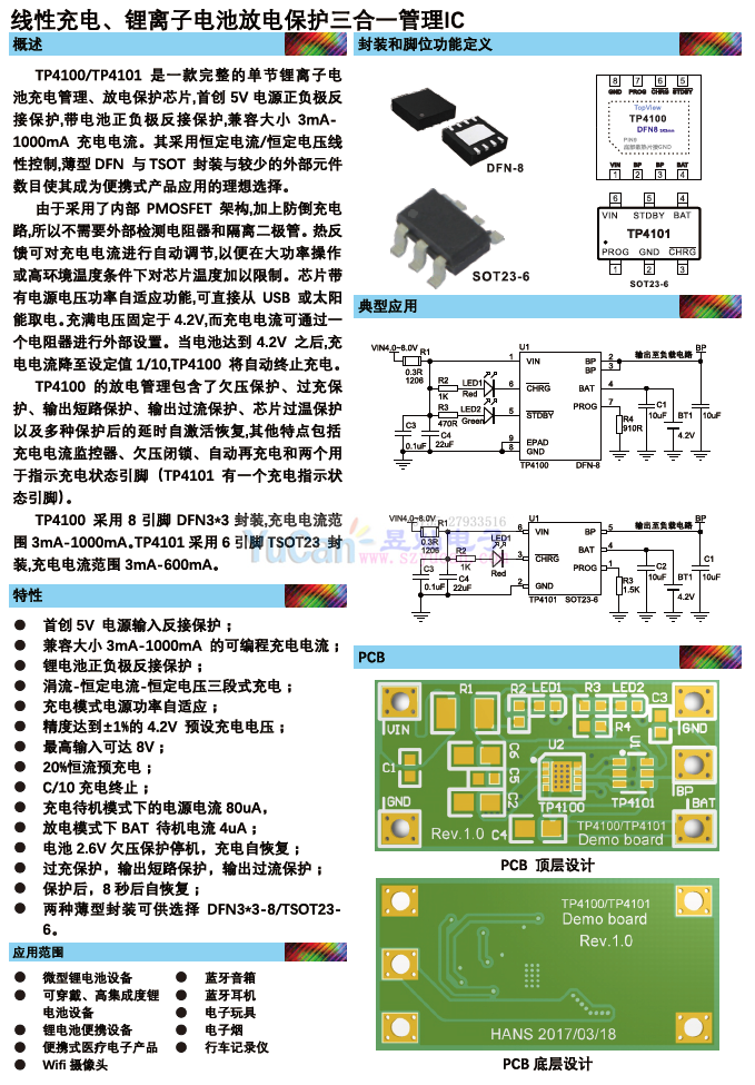 TP4100/TP4101是一款完整的單節(jié)鋰離子電池充電管理、放電保護(hù)芯片,首創(chuàng)5V電源正負(fù)極反接保護(hù),帶電池正負(fù)極反接保護(hù),兼容大小3mA-1000mA充電電流。其采用恒定電流/恒定電壓線性控制,薄型DFN與TSOT封裝與較少的外部元件數(shù)目使其成為便攜式產(chǎn)品應(yīng)用的理想選擇。由于采用了內(nèi)部PMOSFET架構(gòu),加上防倒充電路,所以不需要外部檢測(cè)電阻器和隔離二極管。熱反饋可對(duì)充電電流進(jìn)行自動(dòng)調(diào)節(jié),以便在大功率操作或高環(huán)境溫度條件下對(duì)芯片溫度加以限制。芯片帶有電源電壓功率自適應(yīng)功能,可直接從USB或太陽(yáng)能取電。充滿電壓固定于4.2V,而充電電流可通過(guò)一個(gè)電阻器進(jìn)行外部設(shè)置。當(dāng)電池達(dá)到4.2V之后,充電電流降至設(shè)定值1/10,TP4100將自動(dòng)終止充電。TP4100的放電管理包含了欠壓保護(hù)、過(guò)充保護(hù)、輸出短路保護(hù)、輸出過(guò)流保護(hù)、芯片過(guò)溫保護(hù)以及多種保護(hù)后的延時(shí)自激活恢復(fù),其他特點(diǎn)包括充電電流監(jiān)控器、欠壓閉鎖、自動(dòng)再充電和兩個(gè)用于指示充電狀態(tài)引腳(TP4101有一個(gè)充電指示狀態(tài)引腳)。TP4100采用8引腳DFN3*3封裝,充電電流范圍3mA-1000mA。TP4101采用6引腳TSOT23封裝,充電電流范圍3mA-600mA。